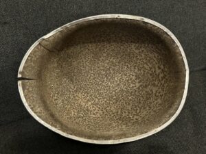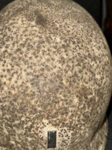 Magnifique don d’un habitant normand, récupéré tout fraîchement hier. Ramassé par lui même après la guerre dans les haies d’un jardin, dans le secteur de Saint-Maur-des-bois (50). Cette coque de casque arbore un insigne de lieutenant. Un passage à l’oxalique permettrait sans doute de faire ressortir des éléments permettant une identification. Pour le moment, elle va rester dans son état de découverte.